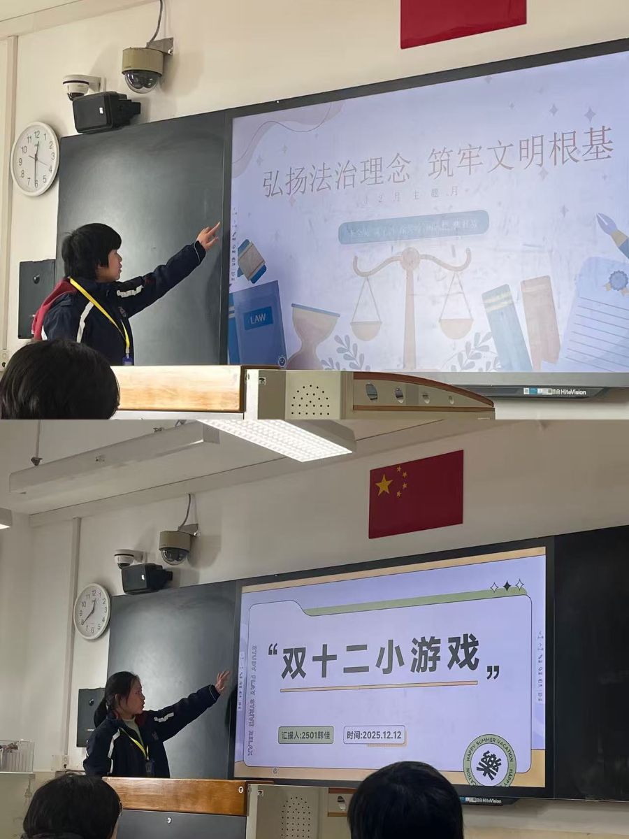 本节班会课分为两个部分。负责第一部分的同学们通过一些真实案例给我们普及了法治理念,让同学们懂得了身边的基本法律知识,帮助同学们知法懂法,同时也教会同学们遇到他人犯法时应作出的正确回应。第二个部分负责的同学通过一些有趣的小游戏帮助同学们放松情绪,增进彼此关系,使原本严肃的课堂氛围一下子活跃轻松起来。