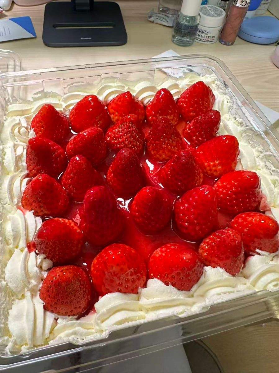 逛盒马的时候一眼就盯上了这款草莓盒子蛋糕,粉红红的草莓铺满表面,光是看着就口水直流,果断拎了一盒回家!打开盖子的瞬间,浓郁的奶油香混着草莓的清甜扑面而来,整整一层饱满的草莓果粒嵌在奶油上,每一颗都红彤彤的,看着就新鲜。蛋糕底层是松软的戚风,中间夹着淡奶油和草莓酱,用勺子挖一勺,戚风的绵软、奶油的丝滑和草莓的酸甜在嘴里融合得恰到好处。奶油一点都不腻,是清甜的动物奶油口感,草莓咬开汁水四溢,酸甜的味道中和了奶油的香甜。坐在书桌前,一边挖着蛋糕一边追剧,冰冰凉凉的口感太适合解馋了,一大盒蛋糕不知不觉就吃了大半,盒马的这款草莓盒子蛋糕真的戳中了我的甜品喜好,下次逛盒马还要回购!