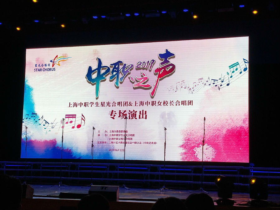 6月12日的晚上7点,在徐汇区青少年活动中心剧场中,“中职之声”专场演出,由上海中职学生星光合唱团与上海中职女校长合唱团合作为我们带来演出。在此场演唱会中,除了由《我和我的祖国》《国家》等爱国歌曲;也有《YOU Raise Me Up》《红红的玫瑰》等经典老歌;更有《来日之歌》《大鱼》等流行歌曲。给人带来的感官体验是前所未有的雄伟壮观。