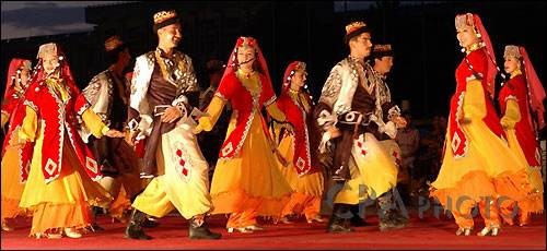 维吾尔族不仅能歌善舞,而且在服饰上也花样较多的。维吾尔族属于伊斯兰教,由于伊斯兰教禁忌偶像崇拜,他们服饰的传承意义是:禁忌在服饰、饰物和建筑物上描绘人物、动物的造型,聪慧爱美的维吾尔人对美的追求转向对以自然物象为内容的图案艺术创作。也因为维吾尔族曾信奉过的萨满教、祆教等对大自然的崇拜等因素的综合作用,维吾尔族把以大自然物象为内容的图案艺术创作发挥到极致。他们以各种花卉纹样, 以植物的枝、叶、蔓、果实图案纹样,以现实生活中的壶、盆、瓶、炉、坛、琴等物的图案为装饰纹样,并以直线、曲线、弧线构成正方形、长方形、圆形、三角形、菱形、星形、新月形、锯齿形等各种各样的规则或不规则的几何图形, 尽情装点维吾尔族服饰。维吾尔族妇女的裙裤、坎肩, 维吾尔族男子的袷袢、腰巾等, 无不展示着独具伊斯兰浓郁风格的维吾尔族服饰之美。