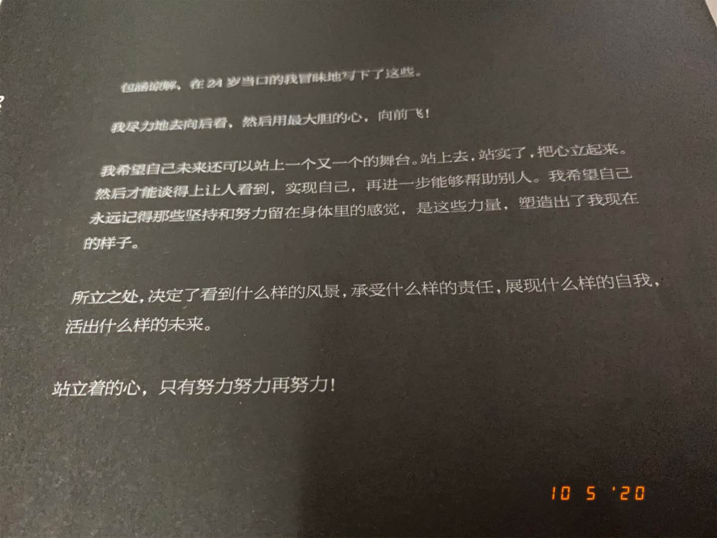 同时他也会有想要放弃的时刻,99条轨道消失的时候,累到练习室的地板全是汗水的时候,不被理解的时候……很庆幸的是,在个快要放弃的时刻,他都会选择坚持下来。