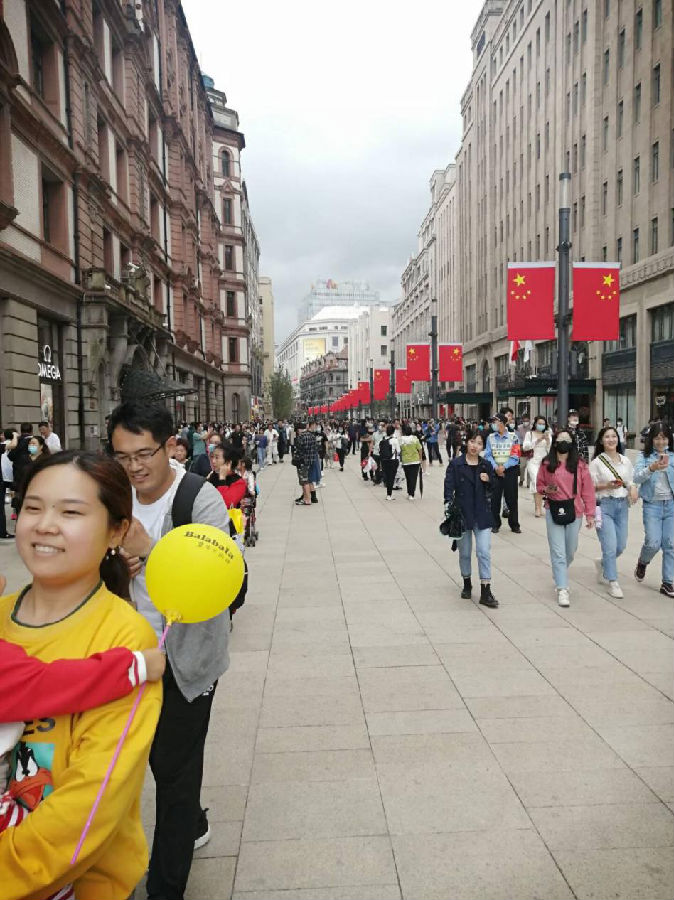 这里是南京路步行街,一眼望去,人头攒动。熟悉的国旗,熟悉的空气再加上熟悉的人一切就仿佛与往常一样又与往常不一样,多了许多“蒙面侠”少了被挤成肉酱的忧伤。这么想来也是一件幸事罢。