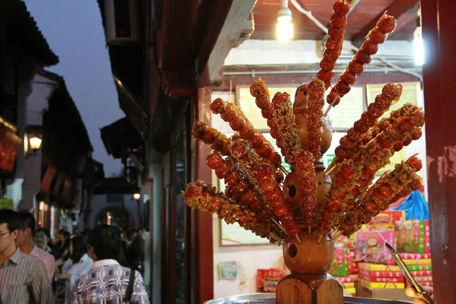 一下车,便看到老街上人山人海,各种小吃琳琅满目,有臭豆腐、鱿鱼串、棉花糖、牙签肉、羊杂汤、叫花鸡、蟹爪膏、章鱼小丸子等等。我恨不得一口气把所有的美食都尝一遍。