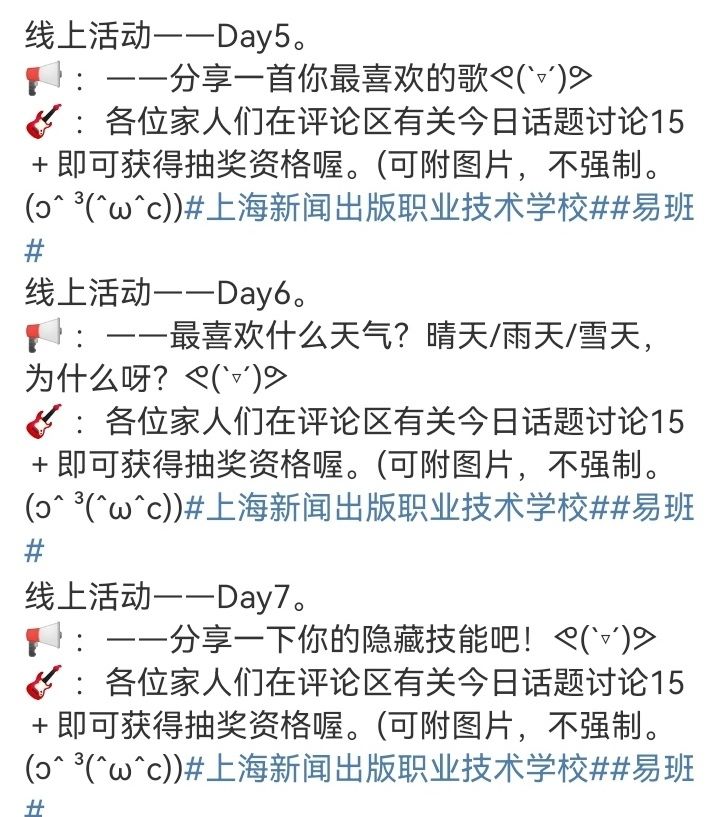 每天早上10点,我们的易班站员们在微博与抖音两平台开设的“易起来留言”栏目中准时发布视频与话题。每天发布的视频,展现了过去易班举办的精彩活动,带领同学们回到美好的校园时光。活动期间,上线了14话题,从分享喜欢的歌曲、影片、明星再到分享日常生活、才艺等,设计范围广泛,吸引力十足。同学们积极参与,各抒己见,纷纷打卡留言,或是讲述着自己所热爱的事物,一字一句都透露着生活的朝气,或是述说自己的迷茫,得到其他同学的留言鼓励。