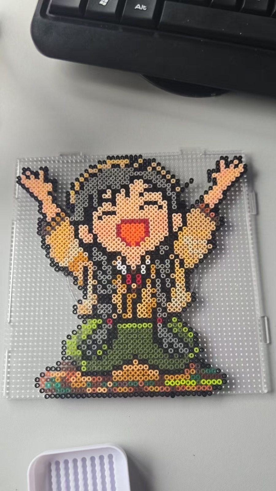 拼豆是一项超治愈的手工,需要把一颗颗彩色小豆子在模板上拼出图案,再用熨斗加热固定。这个过程不仅能锻炼专注力和耐心,还能在完成时收获满满的成就感。这幅作品把卡通人物的灵动与快乐完美定格,无论是摆在桌面当装饰,还是作为礼物送给朋友,都充满了心意与温度,每一颗豆子都藏着手作的温暖与美好。